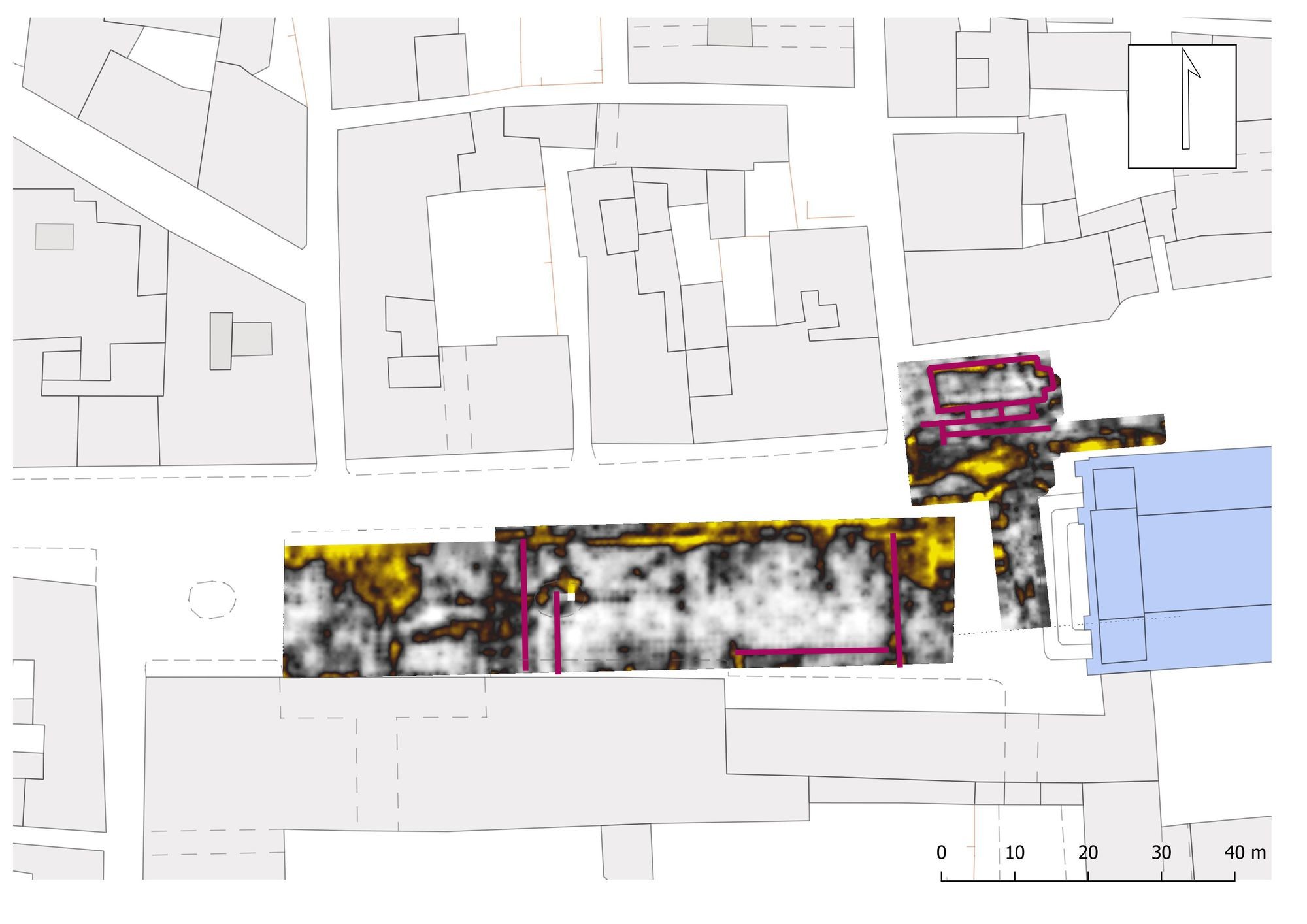 The discontinuities that can be linked to archaeological structures, instead, are the black straight ones highlighted in purple (fig. 5). The two parallels located on the left could be possibly connected to the edges of the Roman cardine and the others placed behind the left one can be read as structures linked to the road. The North to South alignment on the right instead can be related to the western wall of the colonnade. Much harder is the comprehension of the longitudinal anomaly in the lower part of the map. It can be thought of as an ancient structure that was placed in the square closed in by the colonnade or a more recent one, placed here when the monument had already lost its original function.