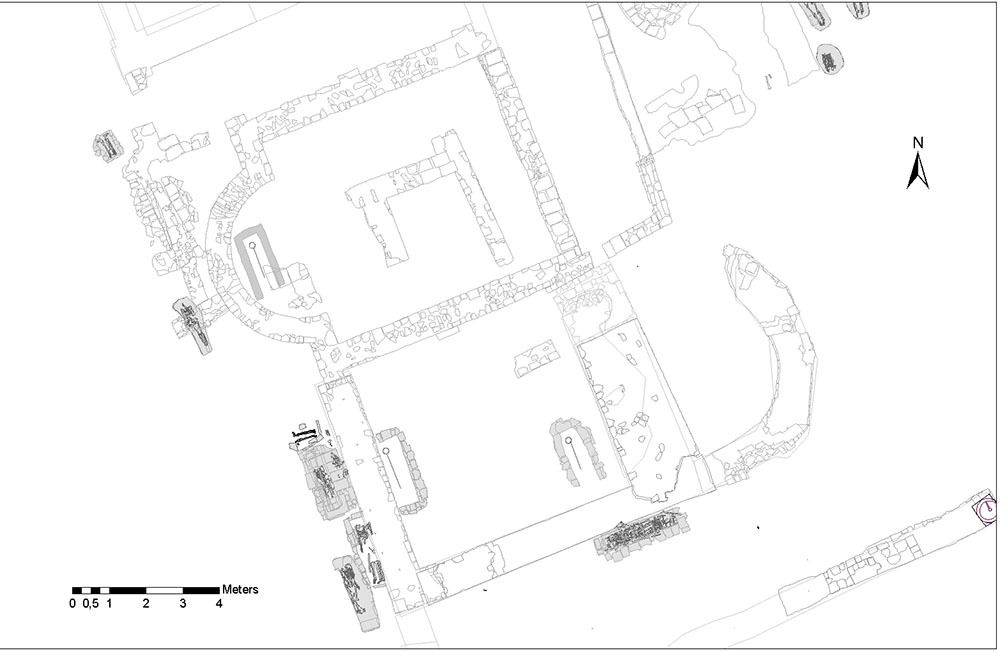 The oldest burials are situated inside the mausoleum and the basilica wheras, later ones are located along external areas, until the Middle Ages; in this period burials “invade” the available spaces, but also overlap and cut into one other (Fig.3). The burial areas so far identified are: the mausoleum, the interior of basilica, the outer area of apses, the area outside the northern perimeter of the church ,inside the funerary enclosure; the area outside the northern perimeter and in front of the narthex (area outside the funerary enclosure);the outer area at the southern perimeter of the basilica; the cloister of the monastery; in the narthex and the area of chapter house (Fig.4).