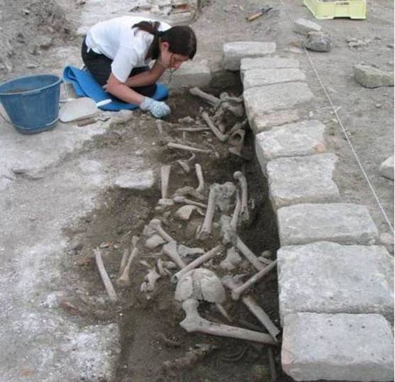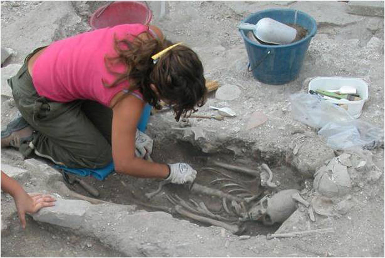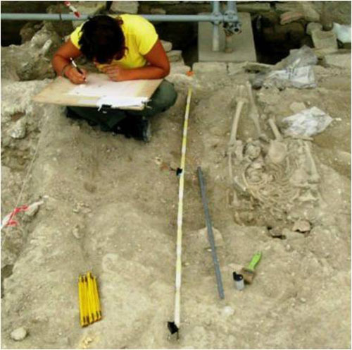 During the excavation is important to identify skeletal elements in situ and spatial relationship to other elements. This activities are based on taphonomic processes which alter the original characteristics of the funerary deposit in order to determine the original burial context. The anthropologie de terrain [10] requires detailed during the excavation to reconstruct mortuary practices and eventually manipulation of the body after the death, during or after the process of decomposition. The interpretation of the funeral practices and rites start with digging up bones (Fig.5).