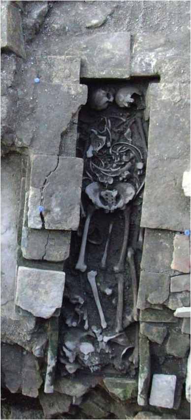Between the 8th and 12th century burials were characterized by some bricks, materials recovered from the villa, placed behind the head of skeletons. In some cases the bricks were also placed at the foot. This practice was useful to indicate the grave to any visitors but especially to buriers. In this waythe cemetery space was ordered and tidy. The brick in fact was standing out of the ground, and was clearly visible. The ground was covered with grass and there is evidence that some fruit tree were present in the area. When this practice ended, the cemetery took on the characteristics of many medieval cemeteries: crowded and intercutting graves [11] (Fig.10).