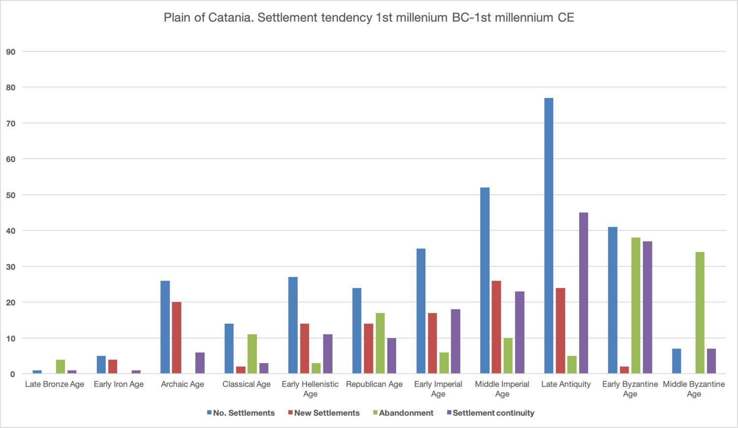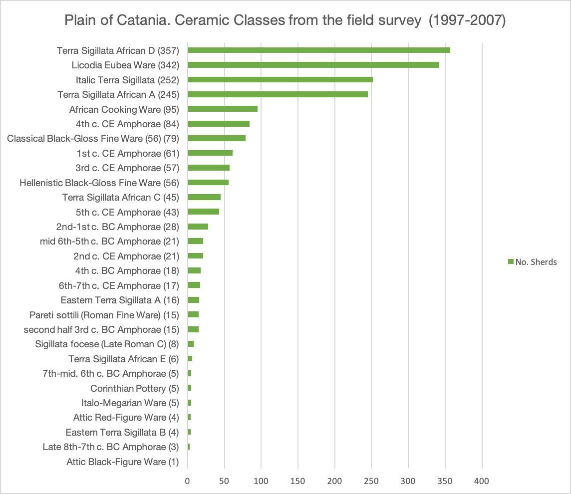 The integration of field survey data from Eastern Sicily (the Plain of Catania) with legacy data available for the region will expand our knowledge on Mediterranean ancient rural landscapes. With an extent of 430 km2, the area is a perfect case study due to its geographical characteristics and the number of archaeological projects (both excavations and surveys) carried out within it in recent decades. Indeed, combining archaeological data from earlier research projects with new survey data allows us to conduct a settlement pattern analysis of the project’s study area. Heterogenous datasets have been integrated through their implementation into a geo-database, featuring the management and integration of topographical units and archaeological entities through semantic relations. Through geospatial data analysis based on the complete gazetteer of archaeological sites (whether sherd scatters, ruins, caves dwellings, tombs or tracks), a new image of rural landscapes for this area of Eastern Sicily from the Greek Archaic to the Late Roman Age can be visualized, beyond the traditional Sicilia frumentaria narrative.