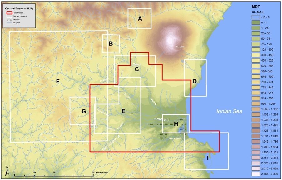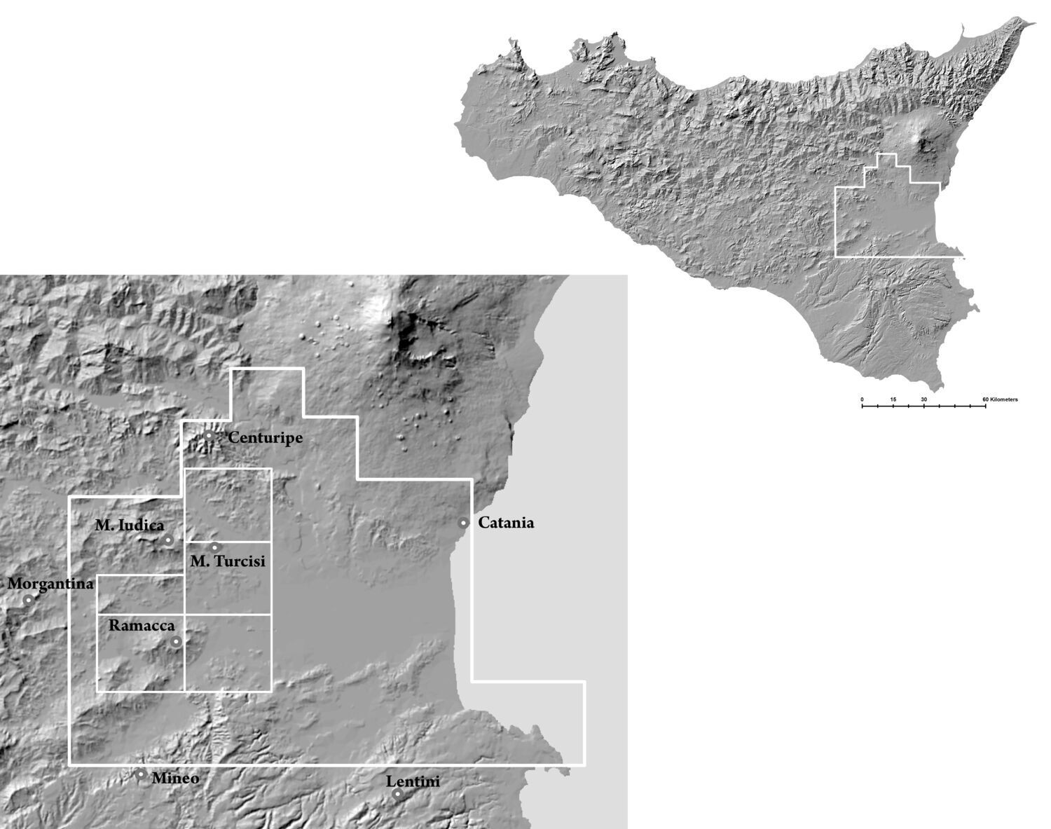 The research seeks to outline the main developments in settlement organization in the Plain of Catania (Sicily’s most extensive at 430 km²) and its surroundings, from the Archaic to the Late Roman period (Fig. 1). The area makes for a perfect case study due to the number of excavation and survey projects carried out within it over the last few decades (Fig. 2). The Plain is located in the interior of the Ionian-Etnean region, its geographical limits being the Etna Volcano to the north, the Hyblean Plateau to the south and the wide extension of the Erean Mountains to the West (Fig. 3). The plain originated in the alluvial deposits of the Simeto, Dittaino, Gornalunga and San Leonardo rivers [1], which cross it through an East to West axis towards the Ionian Sea, and there formed a low sandy coast [2].