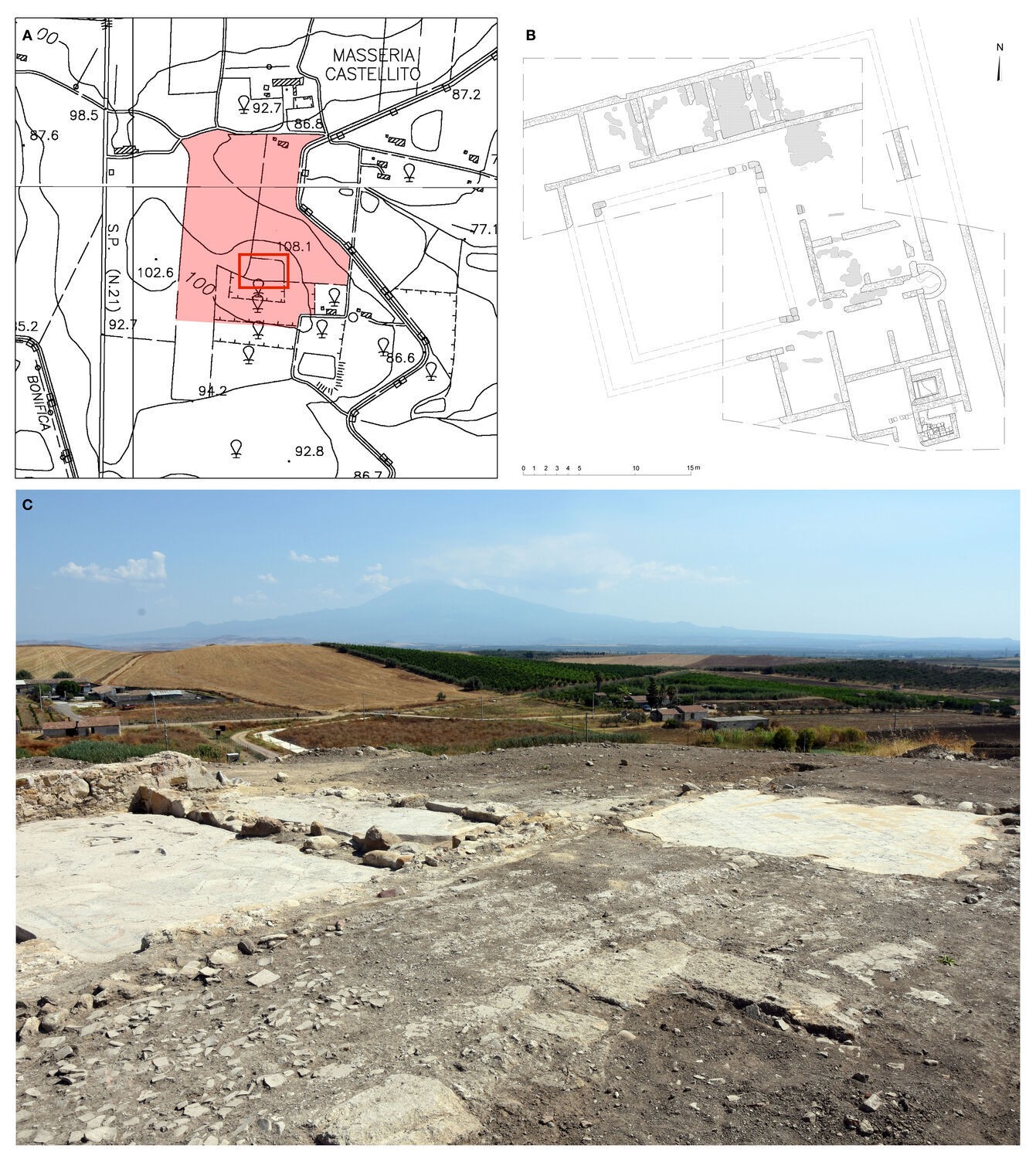 Fig. 9. Sicily, Contrada Castellito (Ramacca), the Roman villa, 3rd-5th century CE: its position in CTR cartography, s. 633100 (A); plan of the excavations (B); the view on the North-East sector of the site.