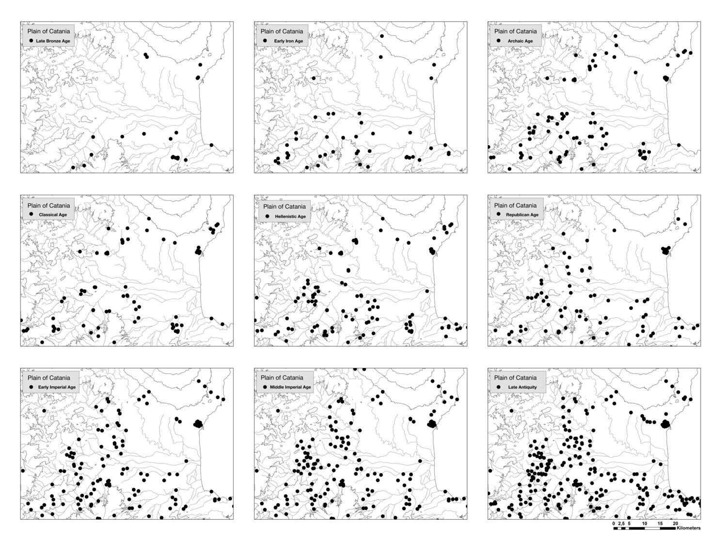 During Late antiquity (middle third to fifth century), survey data points to a further increase in the number of identified settlements [65], which rises from 52 to 77, an increase of 48%; 45 sites out of 77 show traces of settlement continuity, usually associated with a relevant increase in the sherds’ distribution area. New foundations date to the middle of the third century, all usually located at low altitudes: for the first time, a complex settlement system characterized the western edges of the Plain of Catania (Fig. 7).