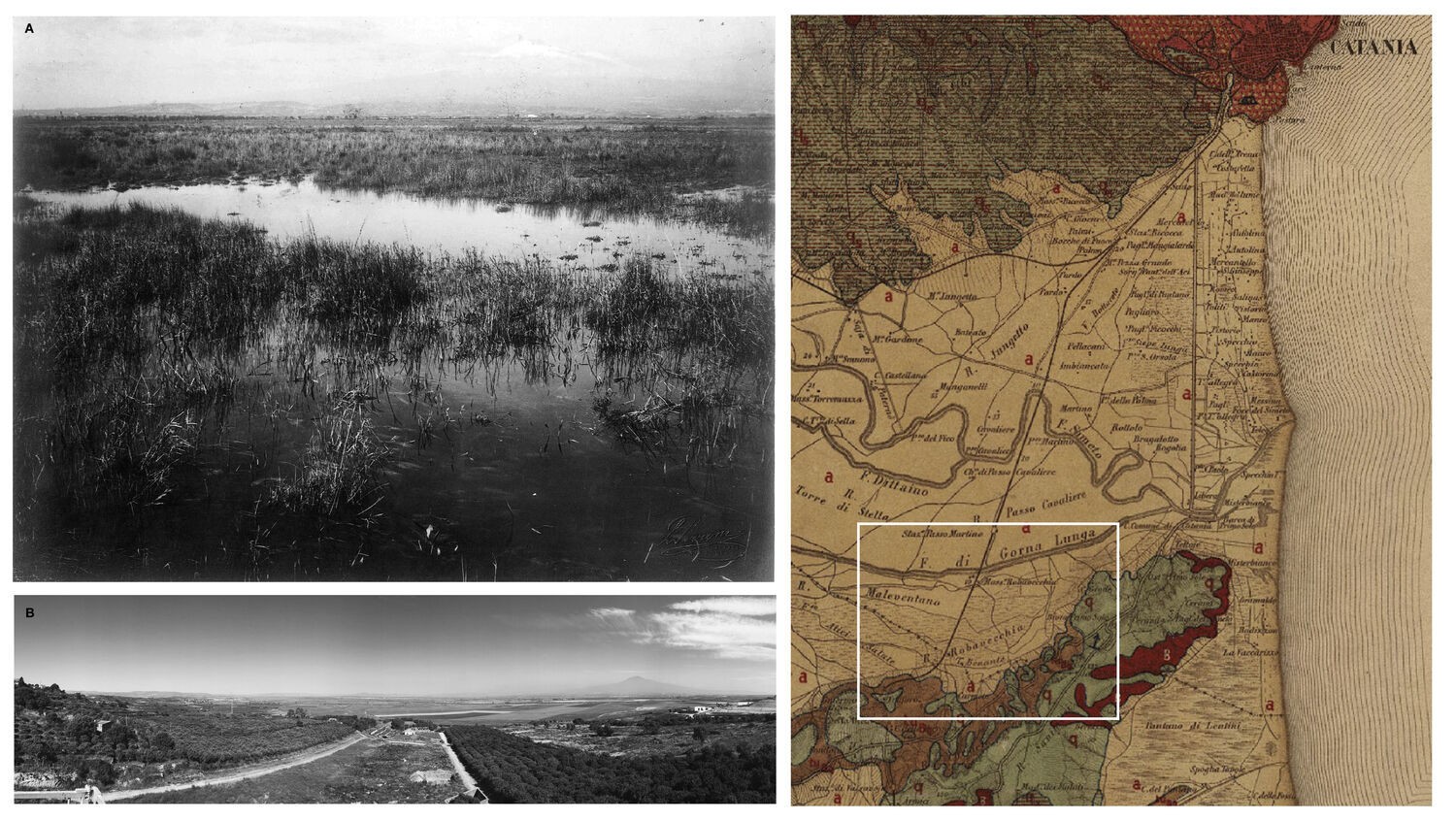 Fig. 11. Sicily, Plain of Catania: marshes in the area of Canale Benante area before the land reclamation works in a historical photo (from Archivio del Consorzio di Bonifica di Catania) (A), in a geological map (Carta Geologica d’Italia F. 270, Sciuto Patti, 1879-80) (B) and in 2019 (C).