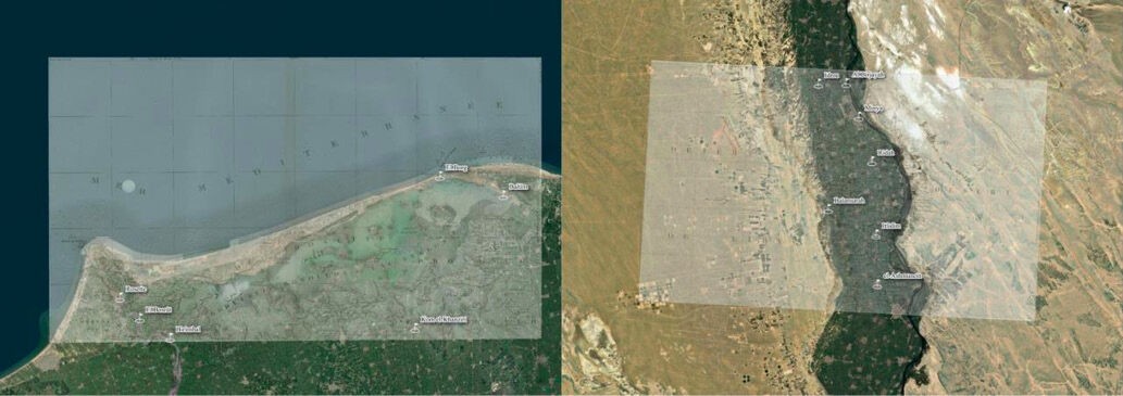 Fig. 4: a) The image shows the result of the georeferencing through visual recognition of control points of the XIV plate of the Carte topographique de l’Égypte overlayed on a satellite image (Esri satellite). It is evident that in the southern part of the map the margin of error increases significantly, especially near the Bahr Yussef. b) The image shows the result of the georeferencing through visual recognition of control points of the XL plate of the Carte topographique de l’Égypte overlayed on a satellite image (Esri satellite). Near the city of Rosetta, the margin of error between the cities is about 1.5 kilometers. In the Delta area, as the example of Kom el-Khanziri shows, the shift amounts to 3 kilometers.