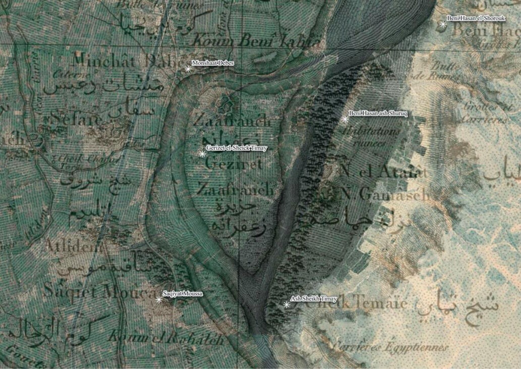 As a result of these comparisons, it is now possible to narrow down the search for the island of iw-rd to the following areas: the entire area of today’s Geziret el-Sheick Timay; the area south of Nuwayr; the area north of the village of Matahrah el-Sharquiyya; the area south of the village of Nazlet el-Awam; the area near Damris. In particular, the island of Geziret el-Sheick Timay appears from the Napoleonic cartography to be of considerable size (an area of about 5 square kilometres) and also it is located in a strategic position between two narrows of the bends of the Nile. This is, in my opinion, an element in favour of the fact that it could have been chosen as a place to settle. In addition, the fact that on the island there was an inhabited centre, although modern, is not to be ignored. In the Napoleonic cartography, the island is identified as Geziret Zaafrânéh, which in Arabic means the “Island of Saffron Flower” (Graves 2017, 145 n. 36). It is interesting to emphasise that the Egyptian toponym iw-rd can be translated as “Island of Plant(s)”, which suggests a possible semantic connection between the two toponyms. In this area there are several tells, one of which is located in the village of Zaafrânéh (Graves 2017, 208), now part of the mainland, south of the village of Monshat Debes. Therefore, one can suppose that, among the various islands present in the territory of mȝ-ḥḏ, the island of Geziret el-Sheick Timay could correspond to what in the Pharaonic era was the ancient iw-rd (Fig. 7).