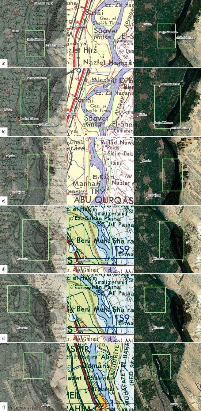 As already mentioned, the plates of the Description de l’Égypte were drafted on a scale of 1: 100,000 meters and therefore they do not provide punctual identifiable references to use as GPC. For this reason, we decided to carry out the georeferencing by setting a scale of 1: 100,000 meters in the GIS project, the same used for the above-mentioned cartography. It should be considered that the decision to maintain a consistency of parameters during the georeferencing process between the GIS project and Jacotin’s cartography was also influenced by the desire to preserve as much as possible the quality of information obtained from the Description de l’Égypte. At the same time, one must consider all factors – both anthropic and non-anthropic – that can potentially compromise the final result of the georeferencing operation, mainly related to the geomorphological changes of Egyptian landscape and its urbanization. In order to provide a practical example, the georeferencing through visual identification of ground control points has highlighted how, what were several villages in the Napoleonic cartography have now grown and merged into a single city and there is no reliable way to use these centres as error-safe control points. The case of the city of Minya may be representative (Fig. 2). This urban agglomeration over the centuries has swallowed up the villages of El Askàs and Damris, making it impossible to distinguish them within the present-day town using only satellite images.