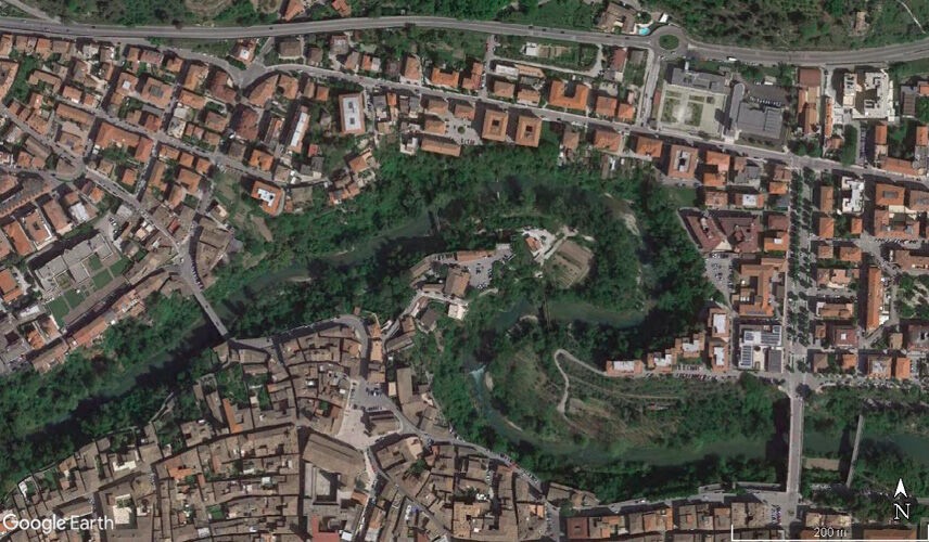 The Municipality of Ascoli Piceno is located at the junction of the high and low valley of the Tronto river. The old town centre is located on a wedge-shaped river terrace slightly sloping towards the north and north-east, and is surrounded by the two main rivers of the city, the Tronto and the Castellano. These river courses surround the urban area along its entire perimeter, except the western side, where no natural defence exists (Fig. 1).