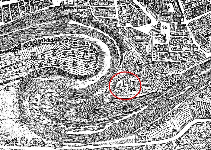 In the history of local studies, the church has been ascribed to several chronologies, depending on the opinion of individual researchers. The various points of view can be substantially divided between those who tend to place the building which nowadays is visible in the 12th-13th century and on the other hand, those who consider it completely late medieval, with various phases ranging from the end of the 14th century to the 15th century [5]. Some sources consider that already in the 8th century there was a church, no more identifiable, which belonged to the Longobard domination of the city [6]. This church was built by the will of Bishop Auclere: he is credited with the numerous foundations of Benedictine monasteries in the territory [7]. Thereafter, in 1069, Bishop Stefano pressed for the construction of a bell tower for defense [8]; this building was certainly still present in the mid-17th century, since it was documented in historical maps, in particular in Ferretti’s map of 1646. As figure 3 shows, the area, surrounded by walls, is characterized by the presence of the Church of San Pietro in Castello and most easterly by the aforementioned tower.