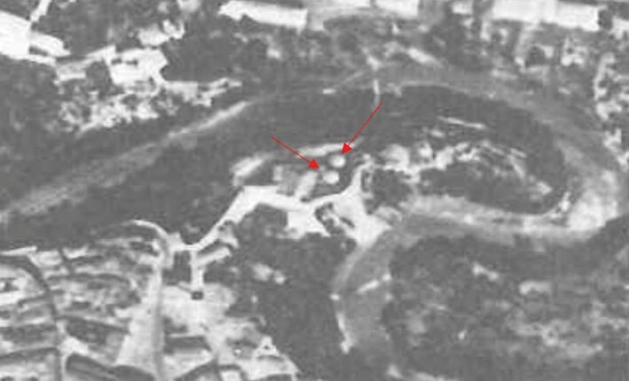 Analysing the traces reflected by the radargrams and time-slice [18], the presence of modern structures is evident: in particular, in the small square on the east side of the church the high energy values visible in the radar profiles, related to wall structures, can be traced back to the foundations of silos existing in the area since the 1950s (Fig. 9), clearly visible in the aerial photograph of 1958 (Fig. 10). Moreover, there are some anomalies connected to them which are probably due to pipes associated to the modern structure (Fig. 11). Also, on the north side of the church there are a series of high energy values denote high subsurface contrasts, probably related to wall structures connected to the basement floors of modern buildings (Fig. 11 S3-S4 structures).