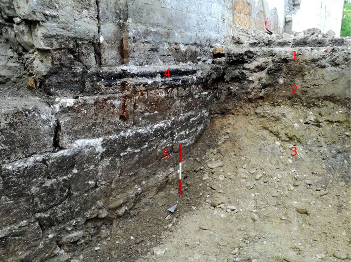 The archaeological excavation measures 6.00 m in a north-south direction, 4.00 m in an east-west direction for a depth of about 1.80 m. The stratigraphy highlighted the presence, below the modern walking surface and its preparation (US1, total thickness about m 0.30), of a level of anthropic soil (US2), thickness m 0.40, which cannot be dated because no diagnostic materials have been found and the layer is strongly affected due to recent interventions. A high level of gravel and river deposition pebbles (US3) detected underneath the layer and investigated for more than a meter of depth (Fig. 15). The side façade of the church (USM4) has been covered by modern surface layers and appears to be in phase with US2. The building’s foundation (USM5) is set directly on the river gravel (US3) (Fig. 16).