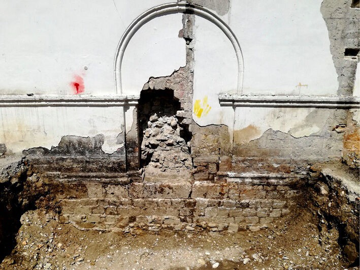 The most relevant data are the radargrams collected inside the church coming from the grid conducted inside the church. The presence of numerous reflections with the characteristic shape of hyperbole located at depths between 0 and 0.30 m should be taken into account; these anomalies correspond to the probable presence of elements related to the base of preparation of the pavement (earth mixed with pebbles, metal elements), visible on all the profiles collected in the area. These reflections create a downward disturbance, making it difficult to interpret the anomalies that are present at a greater depth. However, starting from a depth of about 0.70 m is possible catch a glimpse of the buried archaeological evidence in the narthex of the church. The high values visible in the radargrams show heterogeneities layers that can be attributed to the presence of structural evidence (Fig. 12). By comparing GPR data with the stratigraphic analysis of the elevations (see paragraph 3), several interesting correspondences can be found for the southern front of the church, where it is possible to see a portion of a pre-existing brickwork, USM 208 (Fig. 13), reused as a support for the construction of the church, in analogy to the suggestion derived from the geophysical investigation.
