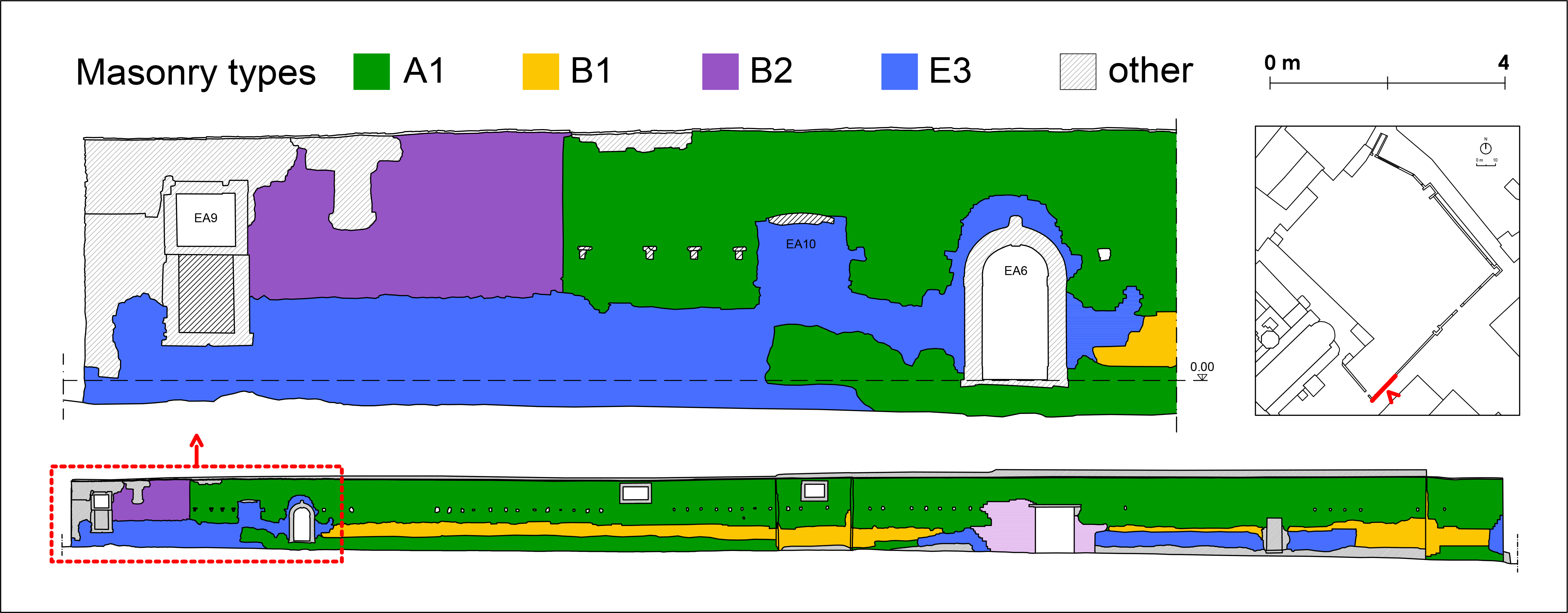| E3 | Structures in mixed materials: barely refined stone blocks and a minor presence of bricks. Blocks are reused, small and lack in refining of their surface. They are laid in irregular rows on mortar joints with varying thickness. Bricks had been reused and assembled in fragments on irregularly thick mortar joints. |