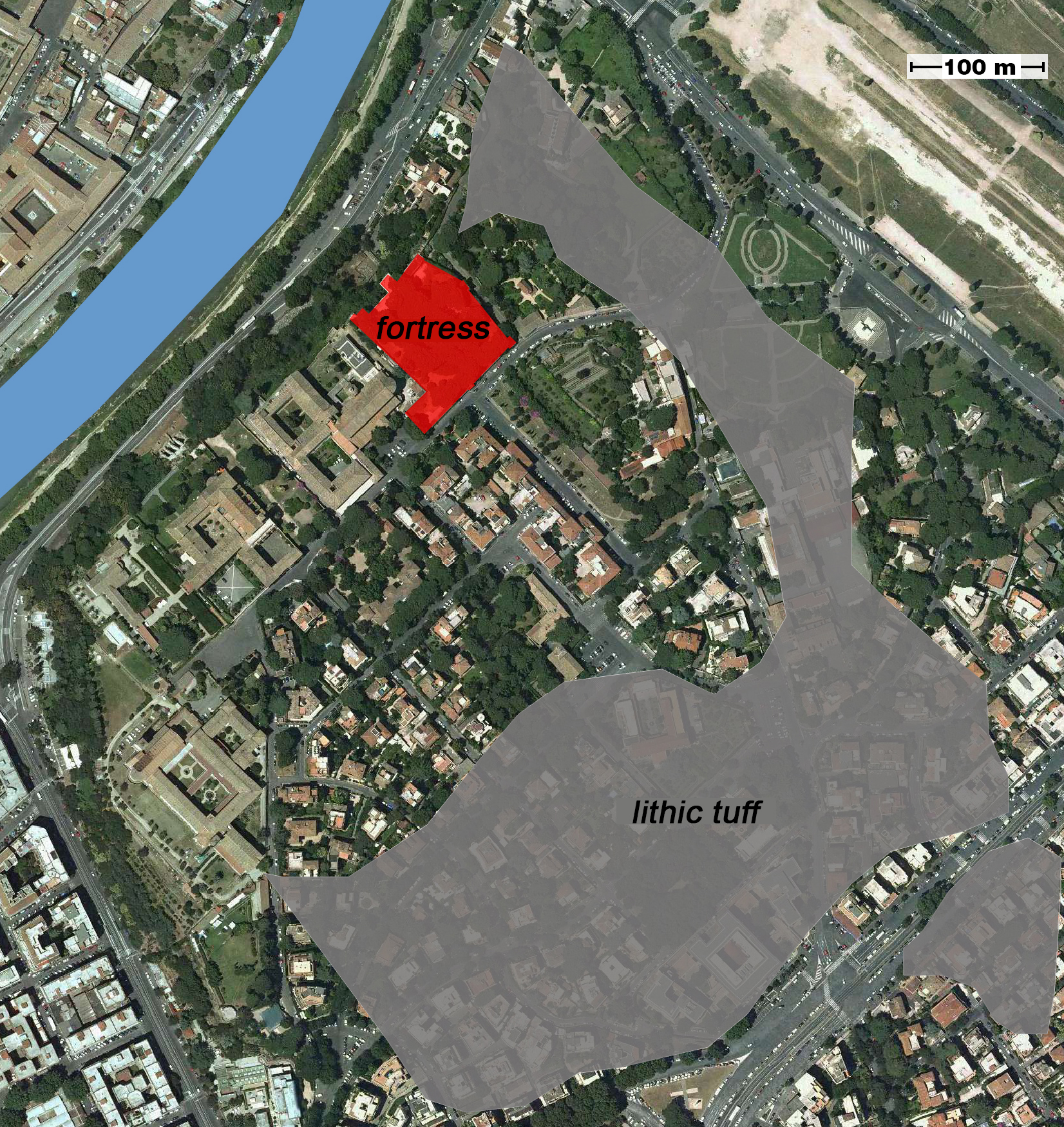 Rocca Savelli is an architectural complex featured by a squared shape (ca. 98x100 m). It is composed of six building compounds (from now on, “BC”), 38 frontages and 11 architectural elements (Fig. 1). BC1 is a gate tower projecting from the walls and belonging to the so-called “a gola aperta” typology (a kind of towers open on the inside). BC2 and 4 are towers located at the corners of the fortification, which have been consistently modified through time. BC5 is a significantly bigger structure placed in the middle of the north-west side of the fortification. The overall surface of this building (now reused as a terrace) is more than 100 m2. It most likely represented the main tower of the fortress, which allowed the visual control of a vast landscape, comprising a portion of the Tiber. BC5 is mirrored by BC3 on the opposite side of the site: a small tower placed in the middle of the walls. Ultimately, the remains of another tower can be identified on north-west corner of the fortification (BC6). Nowadays, the structure has been reused as a terrace. The area surrounded by such defensive system covers about 7,000 m2. The most ancient structures are located in the southern corner of the fortress (Figure. 1). These remains are composed of a brief portion of masonry in roughly refined tuff blocks, with no refining of the external surface. These building components are small and laid in horizontal rows. The thickness of the mortar joints varies across the masonry (Type B2). In Rome and its surroundings, these techniques (so-called ‘a bozzette tufacee’) introduced the arrival of the “regular” coursed rubblework in the 13th century. The walls in small blocks of tuff (Phase 2) are stratigraphically later than this early structure. Therefore, it is possible to propose a chronology around the first half of the 13th century for Type B2. Regarding the function of these structures, it is possible to propose two hypotheses to be verified through further archaeological investigations (GPR and excavations among them): they may either be the perimeter of a pre-existing fortification or a part of a residential complex. Furthermore, the presence of buildings next to the church of Saint Sabina would not contrast with written evidence (Figure2). As mentioned above, the southern portion of the walls of the second phase is supported by the remains of the first one. This later structure was built with a more complex technique, assembled by specialised builders. It can be unambiguously compared with 13th century structures (Fiorani 1996, 154, n. 57; Esposito 1998, 23-24, 74-75, 153-156, 311; Marta 1989, 44-46.). Building elements had been accurately refined, in terms of both shape and surface. Such small blocks are laid in horizontal rows, leaving thin mortar joints (Type A1) (Figure. 3). The presence of small sub-regular blocks instead of more irregular rubble is indicative of the high socio-economic level of the patron (Bianchi 1995). This is confirmed by the first mention of a fortress owned by the Savellis on the Aventine Hill (1279). Based on these data, the second half of the 13th century is the most suitable chronology for the foundation of the fortress (Figure. 4). By analysing stratigraphic evidence and architectural features, it has been possible to reconstruct the sequence of the building activities related to the second building phase. The patrons’ will was probably overseeing a strategic point of the city and protecting their properties: the buildings within the walls, next to the apse of Saint Sabina. Indeed, the inner surface of the fortification is perfectly plane and was most likely artificially regularised. Patrons also decided to have the fortification built with stones. The stone supply came from nearby quarries. The area where the fortress was built is mainly composed of gravels, sands and clays, therefore it must be excluded. However, a vast area stretching north-east and south-east from the fortress seems well-suited as a possible tuff quarry, as documented by geological maps (Figure. 5) 3. Consequently, utilising tuff as a building material may depend on the proximity to its quarries. At the same time, a part of the building materials utilised in the structure may have been reused from previous buildings 4 . After having found the stone deposits, stonemasons must have quarried blocks out through axes or saws. Specialised stonecutters later refined blocks in order to eliminate irregularities. There are no traces related to the refining technique usually known as anathyrosis (in Italian, ‘nastrino’=ribbon), which is typical of specialised stonecutters. However, the considerable regularity of the building components must be related to the sapient refining of highly specialised craftsmen (fiorinini 2019). Blocks does not seem to have been further refined on the side related to the surface of the wall. The tool utilised in shaping blocks was probably some kind of stonemason’s hammer, which left traces. This part of the refining process may have been performed either in the quarry or at the building place. In the first case, the operative chain was more efficient: building materials reached the building place when they were ready to be assembled in the masonry. Transport should not have been particularly difficult, since tuff is a relatively light material compared to other kinds of stone. At the same time, the area was plane and did not require pack animals. Most likely, oxen were used to drag building materials, loaded on wagons (Fiorani 1996, 87; Esposito 1998, 74). About the openings of phase 2, just a few ones have not been altered by deteriorations or later modifications. Among these architectural elements, some small windows are worthy of mention since well connected to the masonry (therefore contemporary with the fortress). These small openings were probably used to oversee the north-east moat (nowadays, Clivo di Rocca Savella) and the nearby road alongside the s