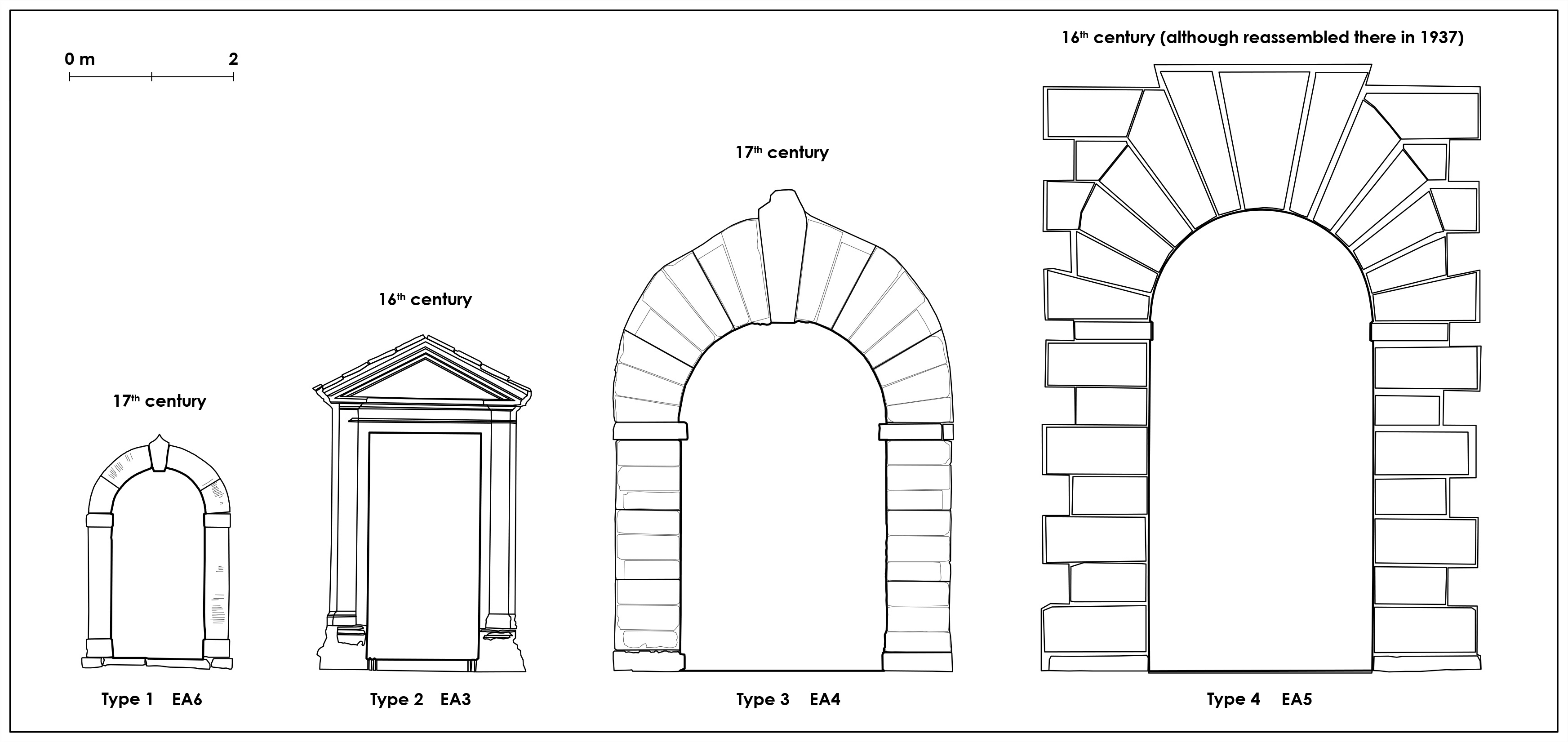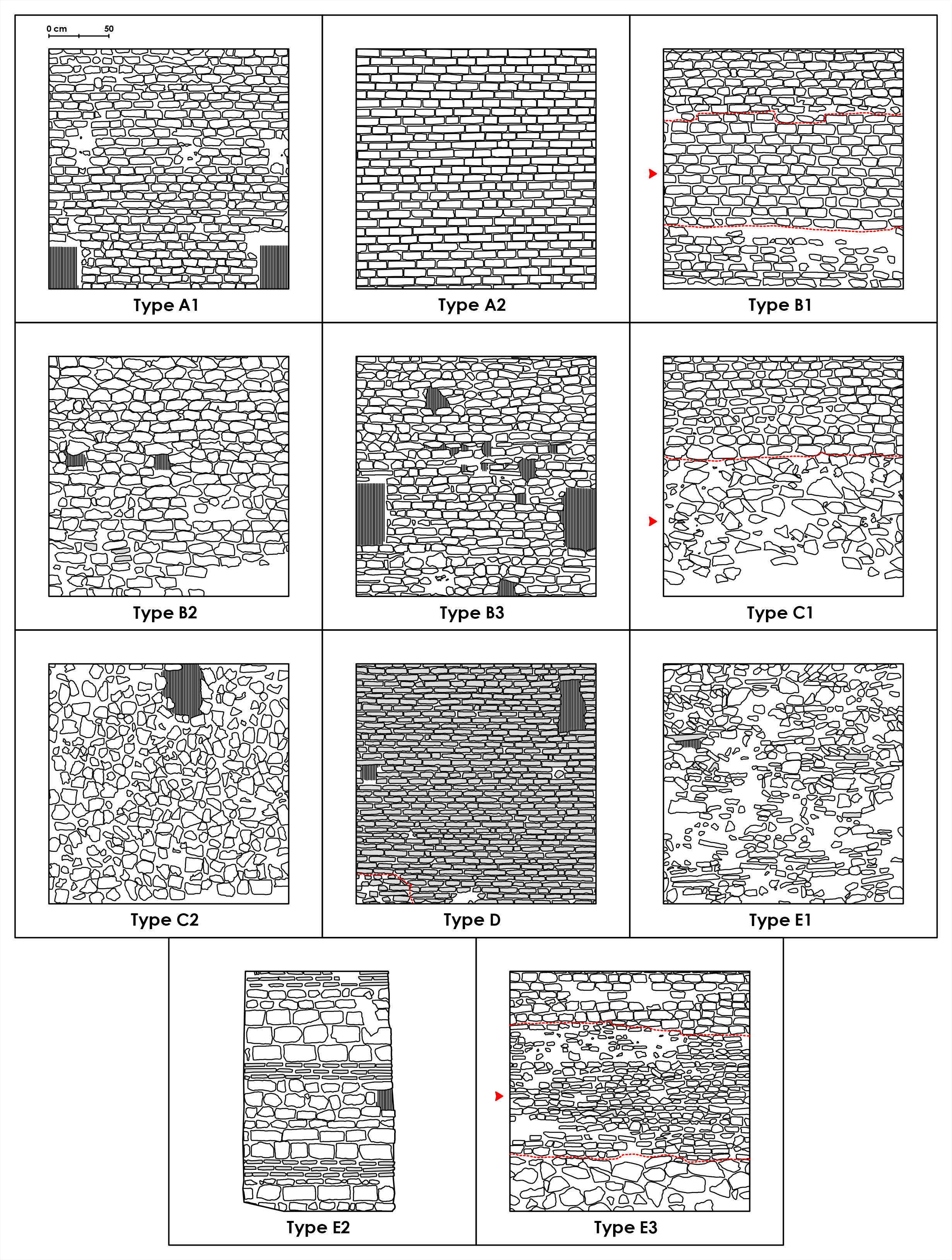| C1 | Structures built with barely refined and heterogeneously-sized blocks, irregularly assembled on mortar joints with a varying thickness. The building organisation did not require the presence of a stonecutter. Walls were exclusively assembled by masons. |