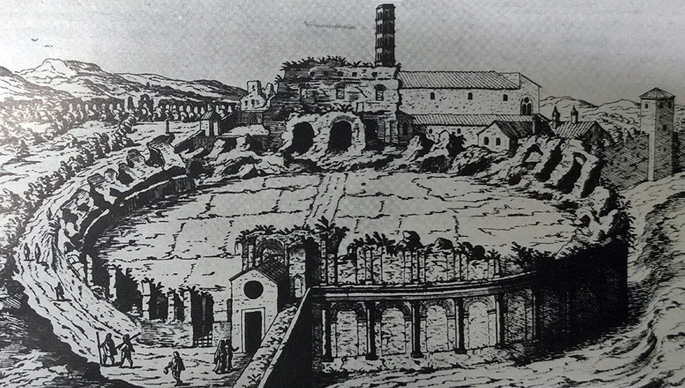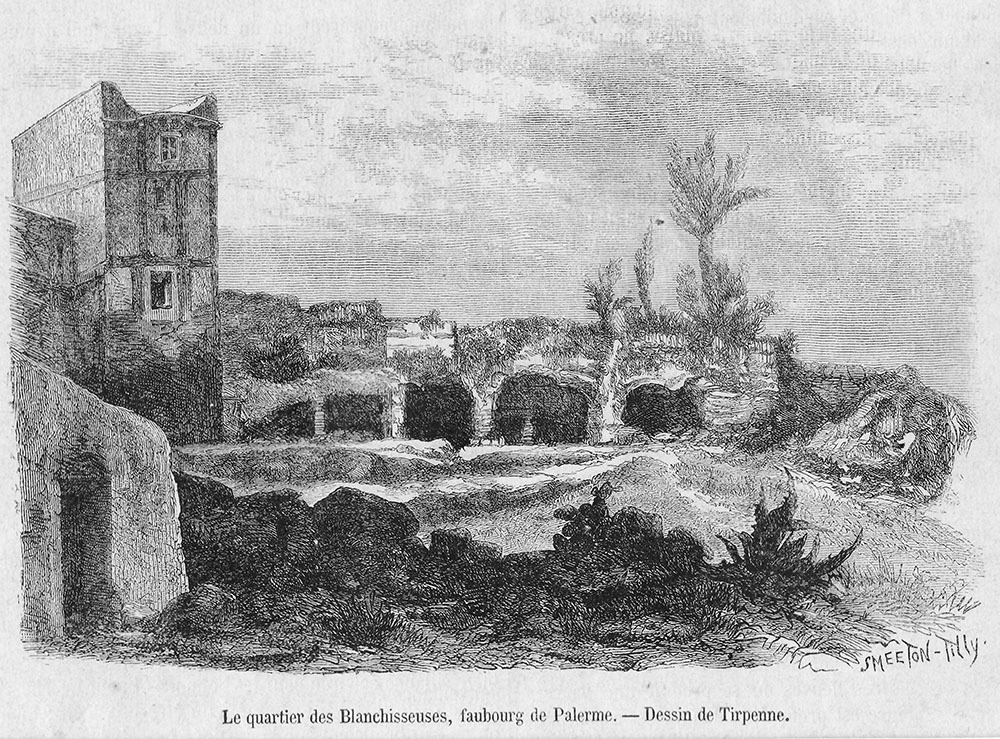 I found an engraving published by the French Journal “Le Magasin Pittoresque” in 1874 (Fig. 1) that illustrates a building in Palermo characterized by an extraordinary similarity to an ancient theatre. In it a semicircular structure with arches can be seen, on the left what seems like the typical half-ring shaped corridor, and in the middle, a structure-free area that could correspond to the stage. The similarity of what is depicted in Palermo with several ancient theatre engravings is undeniable (Fig. 2). The image caption says that the building was in the laundrywomen district. This name is unknown in Palermo but we must consider that via Montevergini leads to a neighborhood named “Panneria”, the place where clothes were produced and maybe also washed. So it seems to be a strict semantic connection with this area and the heading of the image published by the French magazine.