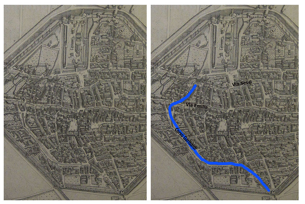 The above cited “veduta Camuncoli” could instead be important for the reconstruction of the urban course of the Crostolo river (Fig. 5). In 1229 it was taken out of the city. It is pretty certain [20], through coring data [21] (and this course is partially still clearly visible in cartography or aerial photos) that during the Roman period, it flowed where “Corso Garibaldi” is now, but we do not know where it flowed once north of the via Emilia; it is supposed that it turned west of Regium, but it is an extremely complex situation. E. Lippolis [22] supposed that north of this important street, at least in the Republican Age, the river turned with a bight to the east and then perhaps then went north, where it surely flowed in Late Antiquity: in fact, a few kilometres north of Reggio Emilia, Crostolo formed, in that period, a large swampland that buried and erased the centuriation [23], the ancient Roman land division. This hypothesis is based on the consideration that in the area known as “Isolato San Rocco” some very close Roman pavements were found at very different depths; furthermore in this area there were some Roman streets that had a strange oblique orientation, pointing to the north-west, while, at least in the Imperial age, the rest of the city streets were all orthogonal or parallel to the via Emilia [24]. Moreover, in the nearby via Sessi [25], between the republican and imperial age structures, a sandy silt layer was found that could be interpreted as fluvial sedimentation. This latter area is far from the more widely accepted north of via Emilia Roman course of Crostolo, but close to the course hypothesized by Lippolis. In the “Veduta Camuncoli” a little stream can be seen north-west of Corso Garibaldi, this may be the dying course [26] of a more recent Crostolo; at the same time, the map reveals the peculiar disposition of buildings and a sinuous street seem to trace the ancient supposed riverbed on the north-east (Fig. 5). On the other hand, it must be noted that a recent study by M. Cremaschi reveals how inconstant the Crostolo was over time; he supposes that during the long period that goes from the foundation of this town in the second quarter of the 2nd century b.C. to the middle ages, many Crostolo courses existed. This could be one of them, maybe in part modified by the Romans to defend their city even on the north-western side. In this case a drawing could give important clues to confirm the validity of a hypothesis created from anomalies in the archaeological data.