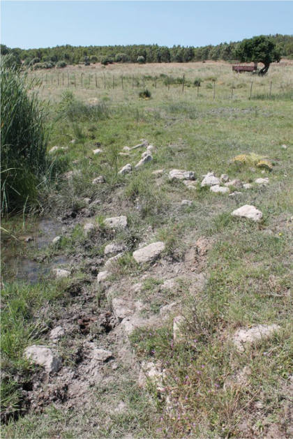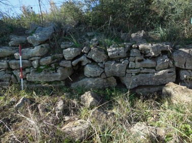 A third wall, located between 250 and 290 m a. s. l., should close the fortified system of Murgie, made in order to block the north-east side of the upland that is less naturally protected and is home to one of the entrances [27]. About this lower wall, we cannot find, at the moment, evidence on the ground [28], which has always been worked on to promote agriculture and where an olive tree grove is located. The only reliable data of the lower wall are in the few areas where it emerges from the ground. We know of these sites through direct testimonies of locals, but these testimonies have yet to be substantiated by indisputable archaeological evidence. It is difficult to trace the dating of the three walls and the temporal sequence of their construction. A survey carried out in 1983, through an excavation project carried out by the Superintendent of archeological goods [29], at the foot of this wall, and in the northern sector, has offered a terminus post quem for its construction in the second third of the 5th century BC [30]. It is conceivable, however, that the lower wall (Fig. 5) and the median one were previously built, thicker and longer, as measured in the investigated point in a recent reconnaissance 2.65 m in width. We propose considering the two walls as part of a unified program [31]; at this time, this is the most likely hypothesis. They surrounded the majority of the plateau and they protected the water source, the sacred area at an altitude of 339.7 m a.s.l. and a scattered building nucleus of the 5th century BC.