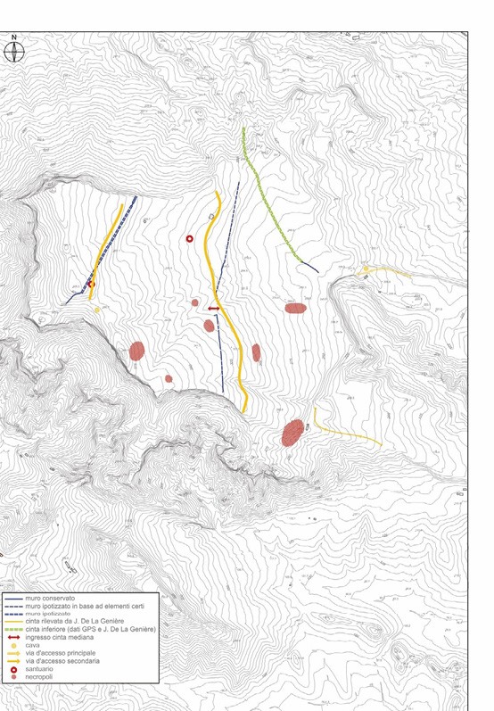 The upper city wall (Fig. 3), which may also function as the containment of the upper terracing, follows geomorphological conformations of the ground and includes a 13 hectare area within a sanctuary, and the Bruttian building is located on the highest plateau point.