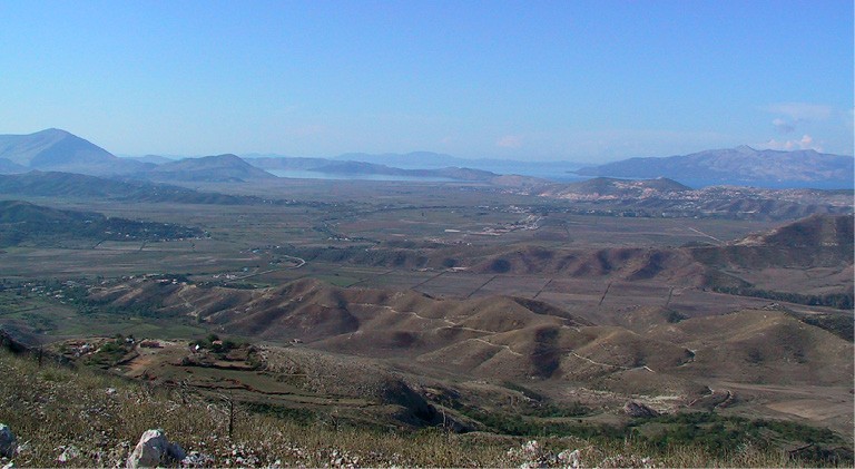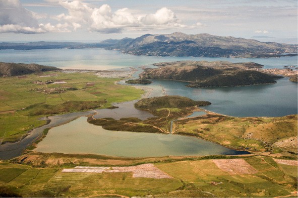 Fig. 7. View of the Vivari Lake with the acropolis of Bouthrotum in the middle and the peninsula of Ksamilli and the Corfu Island in the background (Giorgi, Bogdani 2012. Courtesy of P. Giorgi).
