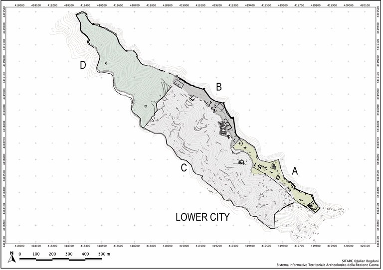 In extreme brevity, as far as the hill of Phoinike is to be considered, even if it is with a few simplifications and while awaiting new research, we can hypothesize a substantial continuity of life for the eastern and central areas of the hill, that is to say the area of the city which more or less corresponds to the acropolis, the widening of the acropolis and to the corresponding upper part of the hill slope (sectors A, B, C of Ugolini). We can instead assume that the euchorion was totally or partially abandoned, and was located in the westernmost area of the hill (sector D) [16].