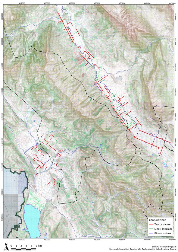 29. Traces of another set of land divisions following the same alignment, but conforming to units divisible by 12 and 16 actus also was detected in the same area. But we have to consider that the centuriation contemplate internal limits (limites intercisivi) even at smaller distances and it is very difficult to distinguish internal limits from others. See: Bescoby 2007, 113; Hodges 2013, 10-12. For the changes until the 13th century see: Greenslade 2013, 126.