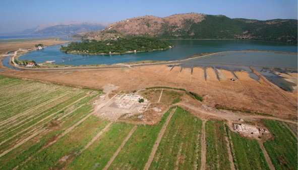 Fig. 8. View of the archaeological excavation in the Vrinë Plain with the acropolis of Bouthrotum, the Ksamilli peninsula and the Corfu Island in the background (Greenslade 2013).