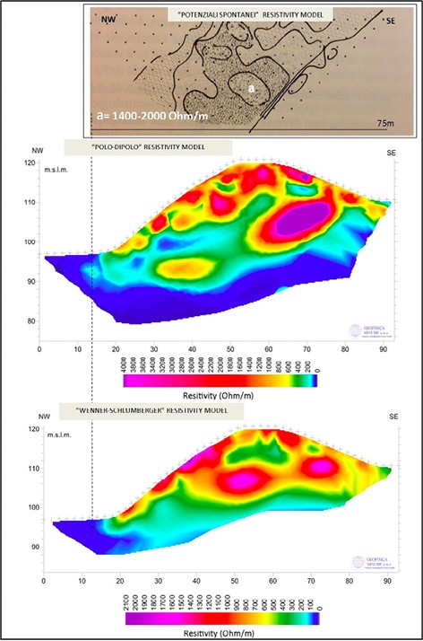 Nevertheless, by using the Wenner-Schlumberger resistivity model (Fig. 4), this anomaly disappears. Therefore, it could be explained as the fictitious result of the combination between analysis models and relief geometry. In general, the summit and frontal part on the NW side of the hillock appears more resistive, with a tendency that seems linked more to the general geological structure rather than to local anomalies.