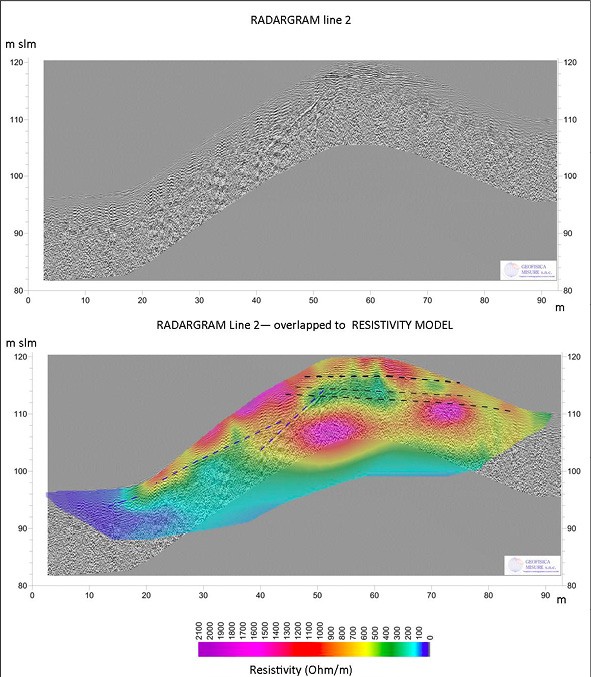 In particular, two new georadar profiles were obtained: one to detect the thickness of cover soils and the structure of the hillock (profile 2); and another one, outside the hillock, along a line we suspect was subject to excavation and deposition of earth material, due to the carving work of slope modelling (profile 1). Geoelectrical investigations were carried out along the same georadar line 2 in order to collect further overlapping geophysical data and compare new data with old ones.