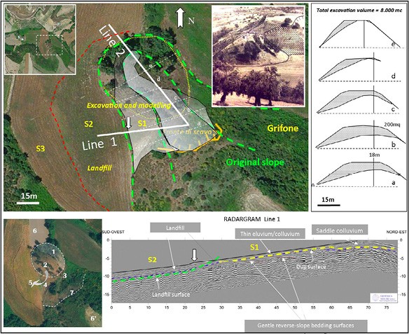 Considering that modelling had to be minimal, we hypothesized a compatible natural morphology of the previous natural slope, in order to acquire data on the possible excavated volume. In particular, the reconstruction of the origin of the excavation took into account the following elements: i) nature and distribution of the soils on the hillock; ii) irregular, full of niches morphology of the slope that from the saddle goes up towards a terrace; iii) morphology of the slope joining the base of the hillock to the valley floor to the SW, along the georadar orientation of line 1, and sedimentological data surveyed by the georadar; iv) flexure point of the hillock SE slope, which delineates an anomalous, convex-shaped profile due to interfluve incision.