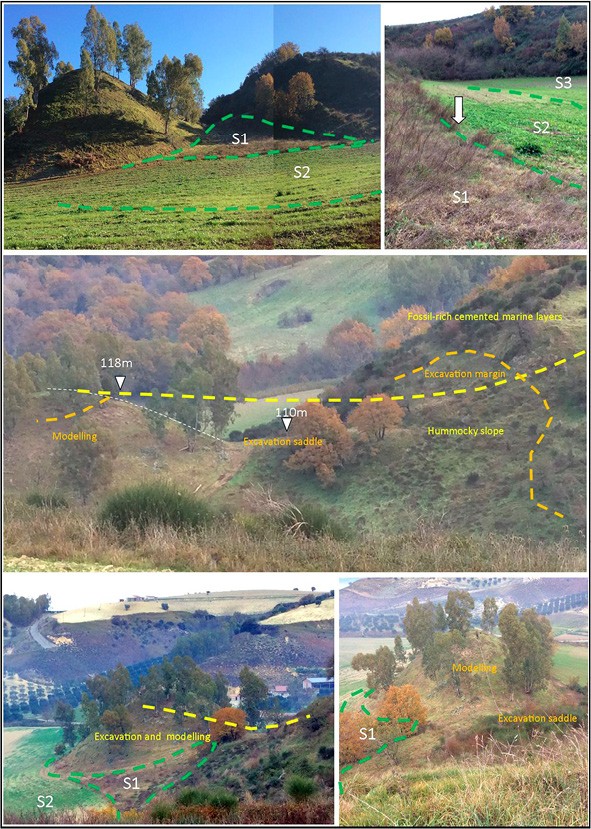 Field geomorphological survey, compared with analysis of aerial photographs, suggests that the morphological features of the Cozzo Rotondo hillock could be partially related to anthropogenic interventions. In particular, the saddle separating the hillock from the SE slope, which in turn slopes down from the adjacent terrace, is anomalous with respect to the surrounding interfluves. The latter are not separated from the fluvial plain by reverse slopes or sub-circular cuts, as in the case of Cozzo Rotondo. Moreover, on the slope next to the hillock there is a debris accumulation in the shape of a terrace that is not stratigraphically related to the outcropping rocks. This deposit, rather lumpy in shape, was clearly modelled by man. It is also characterised by a small bluff, referable either to a gravitational collapse trench or to the trace of an ancient footpath now abandoned. This debris accumulation could therefore be the dug landfill or part of it, resulting from the deepening of the saddle at the foot of the slope and remodelling of the hillock.