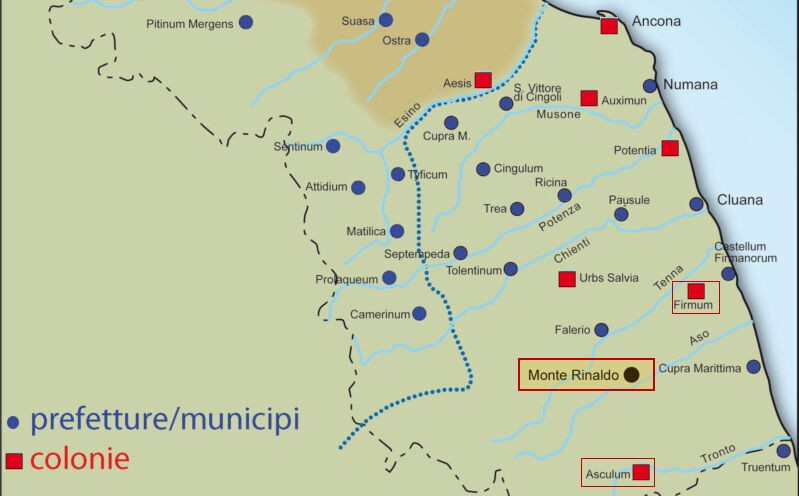 The area of Monte Rinaldo was occupied by Rome after the conquest of the Picenum (268 BC). In the aftermath of the conquest, which also included the Tenna and Aso valleys, the Latin colony of Firmum was deducted. The Aso valley, in the most precise historical reconstruction, represents the southern band of the colony’s ager, bordering the territory of the federated city of Asculum [5].