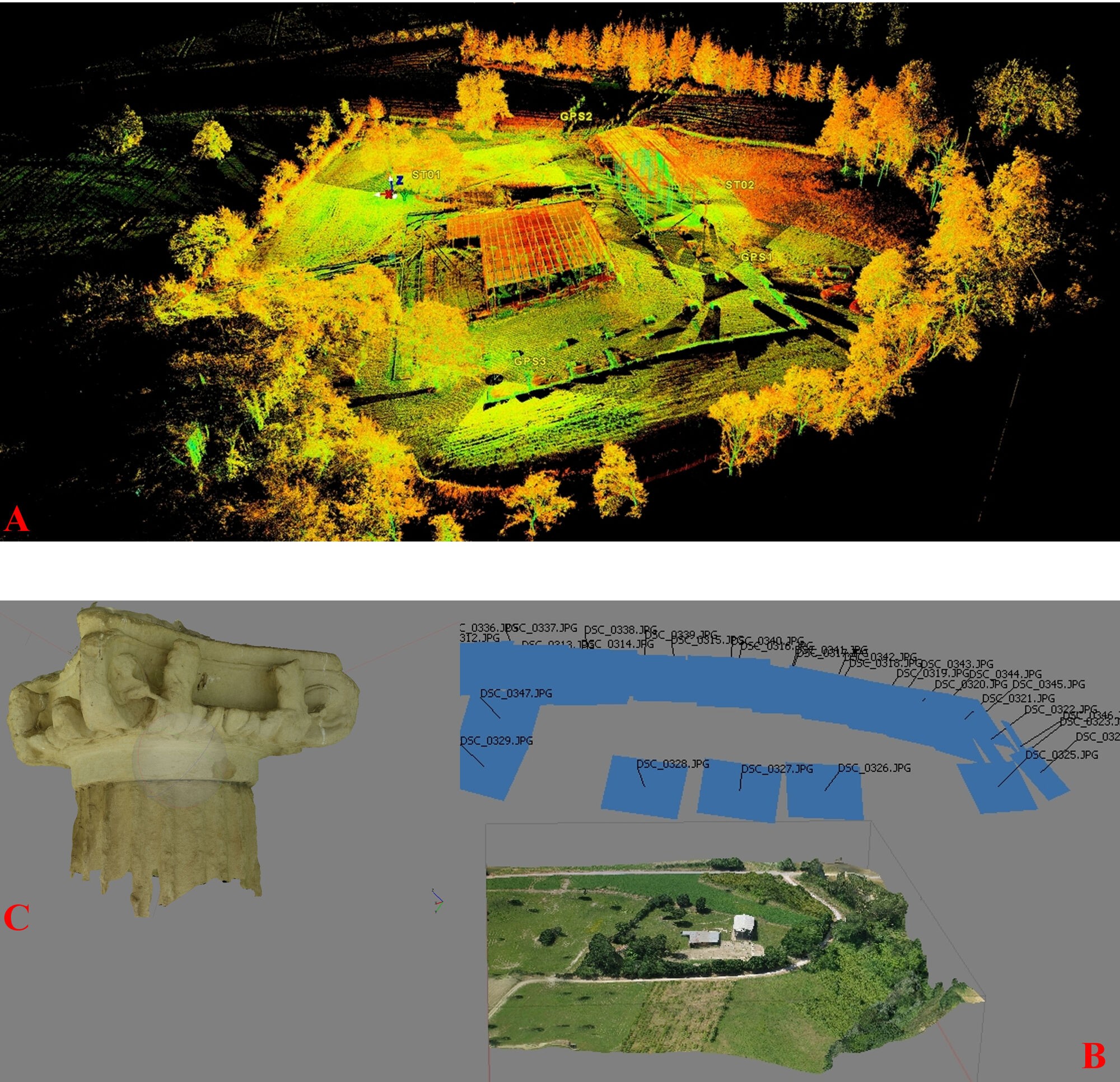 Fig. 2: A- Laser scanner Leica P30 Point cloud: B- Image based photogrammetric mapping of the site of the sanctuary; C- Image based photogrammetric mapping of the architecture of the sanctuary.