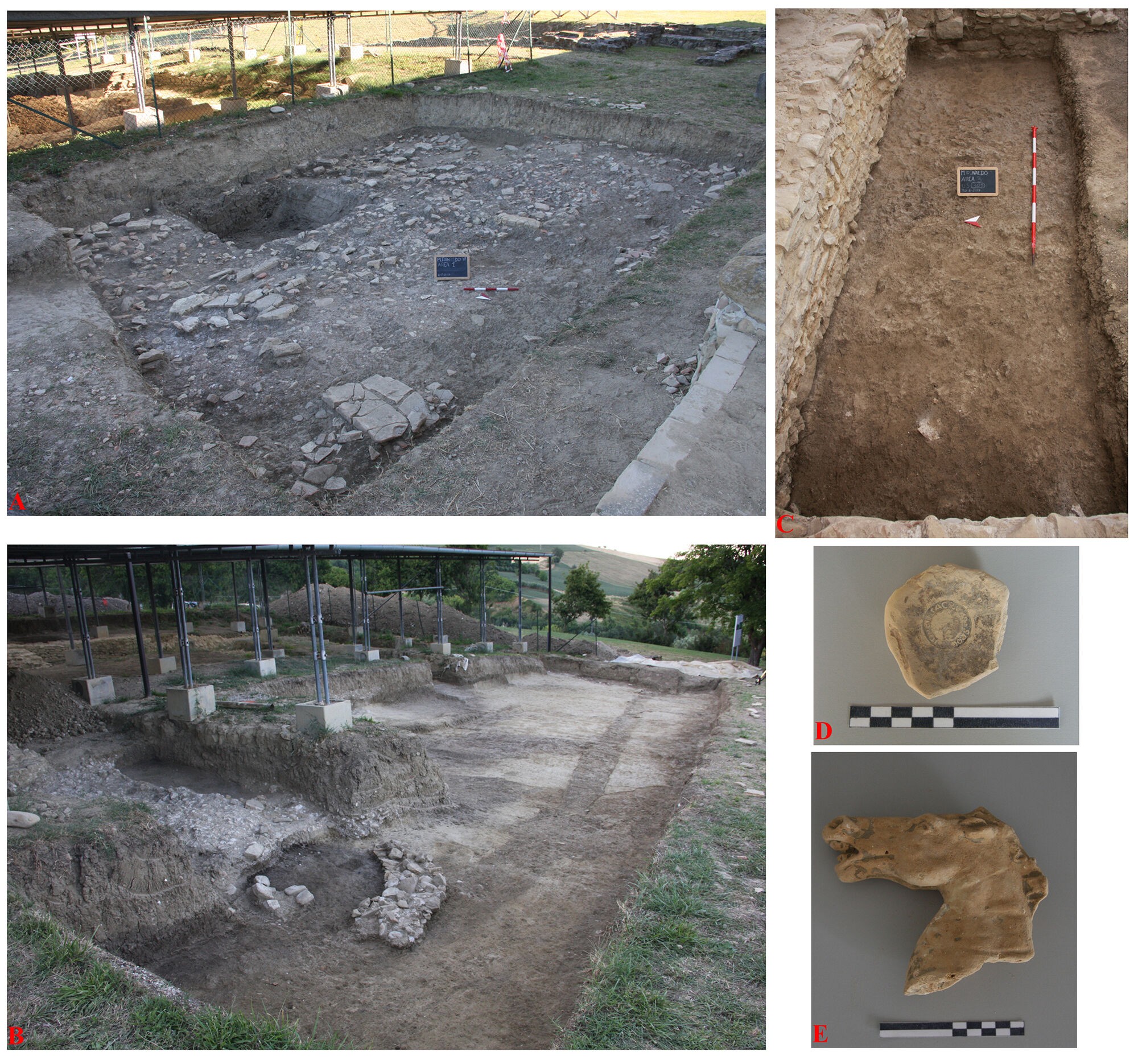 Fig. 3: A-B-C Survey areas of the first excavation season of the University of Bologna (2017); D: stamp “Iovei Sacrum” on black glazed cup; E: terracotta horse head relating to a continuous frieze from the area of the main temple.