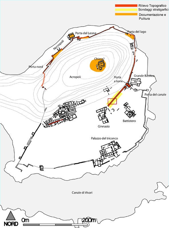 The first excavation campaign of 2018, which essentially can be credited with having reopened the issue, has been limited to a specific sector and flanked by a topographic survey work still ongoing, and which has already yielded important elements for the analysis of the techniques and phases. The first two targeted trench excavations in the section of walls to the west of the Tower Gate, have clarified the phases of reuse of the city walls and the expansion of the city back to the Hellenistic era. In particular, in the fifth compartment from the Tower Gate, the excavation has gone 3 meters deep, to the surface of the water and has allowed a few ceramic fragments and several remains of animal bones still under study to be recovered. Some alterations of the late Roman age have also come to light. The excavation was extended to the west also to the next compartment. In the early Middle Ages, it seems that, throughout this area, on the remains of the shaved walls, a tread floor made of bricks and tiles was set up, cut from an inhumation tomb. This open area gave access to a building whose façade was set on the innermost Hellenistic wall curtain.