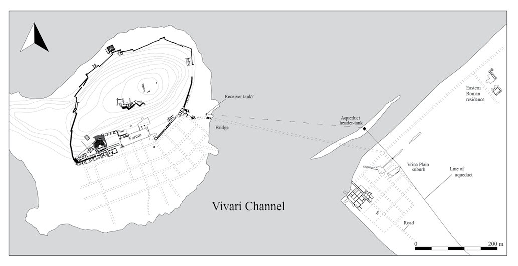 The Vrina Plain suburb coalesced around a road running eastwards from the bridgehead, just east of a north-south palaeo-channel off the Vivari Channel, which possibly provided safe harbourage off of the Vivari Channel (Fig. 2). In the Flavian period, if not before (though Julio-Claudian ceramics and coins are absent), a series of houses of varying sizes were located within a grid of at least four insulae separated by newly made gravelled roads. Some of these houses incorporated shops fronting onto the roads. The angle of its grid of streets, running 6 degrees off that of the cardinal line of the centuriation suggests that other local elements determined its precise location. As part of this expansion a new residential building with associated bath-house was built on the channel edge c. 400 m to the east of the suburb. [21]