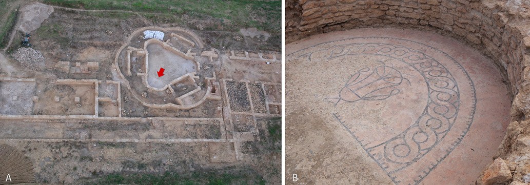 Fig. 1. A) aerial view of the archaeological site. At the top right the foundations of the trefoil hall and ambulatio are still visible. The red arrow highlights the position of the detail B within the site; B) detail of the preserved floor of the trefoil hall.