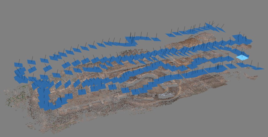 Fig. 3. Data processing in Photoscan of one of the flights. Camera (blue rectangles) position/orientation reconstruction and features extraction (sparse colored cloud) through SFM algorithms. The result of the photogrammetric process allows to see the path of the cameras, performed during the acquisition, reconstructed in the virtual environment.