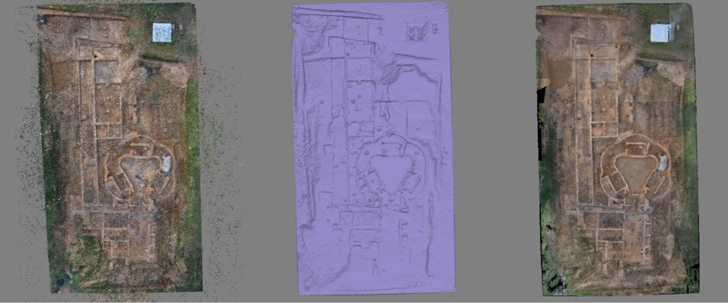 Fig. 4. Data processing in Photoscan. Dense point cloud computation through DSM algorithms; Solid mesh model obtained by point triangulation; Textured model by projection of images.