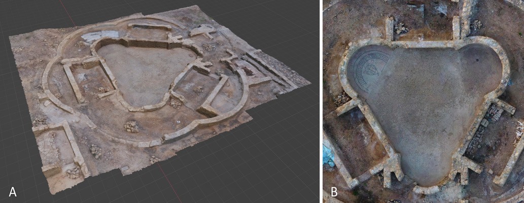 Fig. 5. Outputs of the photogrammetric and optimization processes. A) digital model of the trefoil hall, in its current state of preservation, visualized in a computer graphic software (Blender); B) high-resolution orthoimage of the hall.