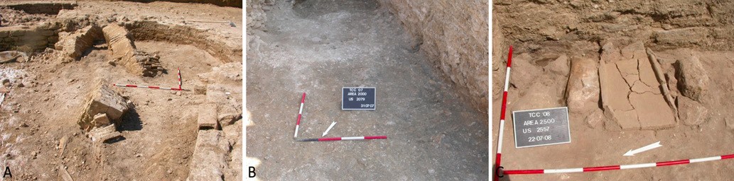 Fig. 6. A) a collapsed brick arch found in the north-east apse of the trefoil hall; B) traces of the collapsed plasters that covered the ceiling; C) roman tiles found during the excavation.