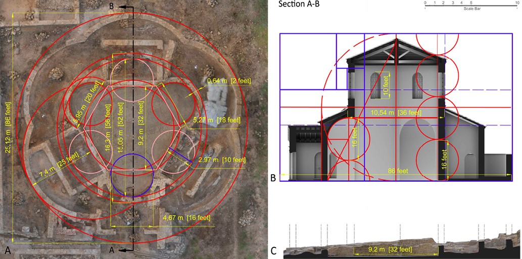 Fig. 8. A) measures in meter and roman feet (approximated) and proportions of the geometrical features found in the layout of the trefoil hall; B) reconstructive section A-B of the hall with roman modules and proportions applied to the wall elevations; C) section A-B of the digital replica of the hall.