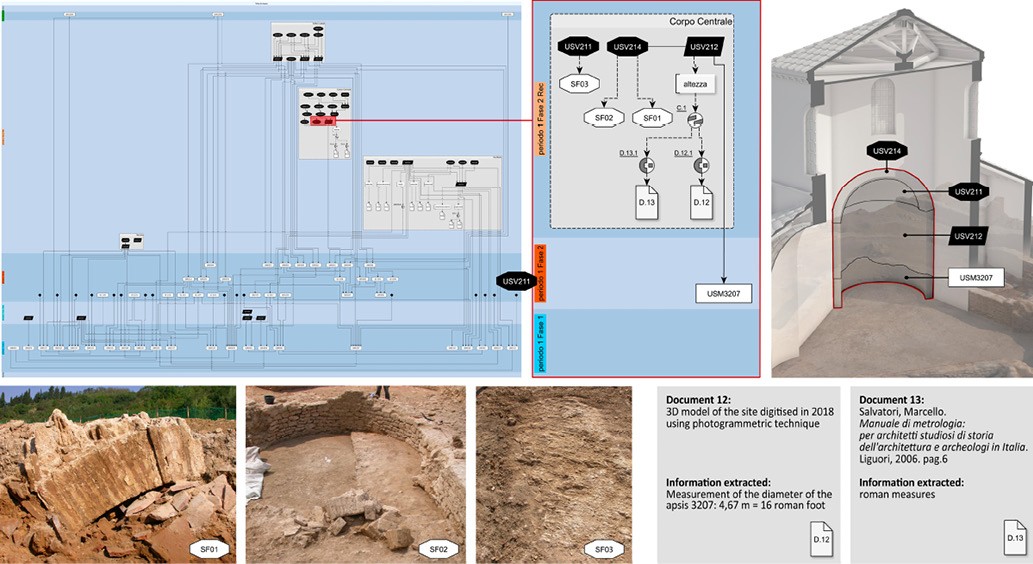 Extended Matrix (EM) is a visual node-based formal language based on a stratigraphic approach in use in archaeology. The term “extended” indicates that it includes and defines not only archaeological stratifications (the superimposition of single units of stratigraphy) but also their hypothetical reconstructions (the Virtual Stratigraphic Unit - USV). Given that using EM it was possible to account, in graph database, the sources used and the interpretation processes (paradata) that have led from archaeological evidences to the reconstructive hypothesis. Finally, through computer graphic tools in the software Blender it was possible to connect sources and paradata with the virtual reconstruction creating semantic transparent models (Fig. 9).