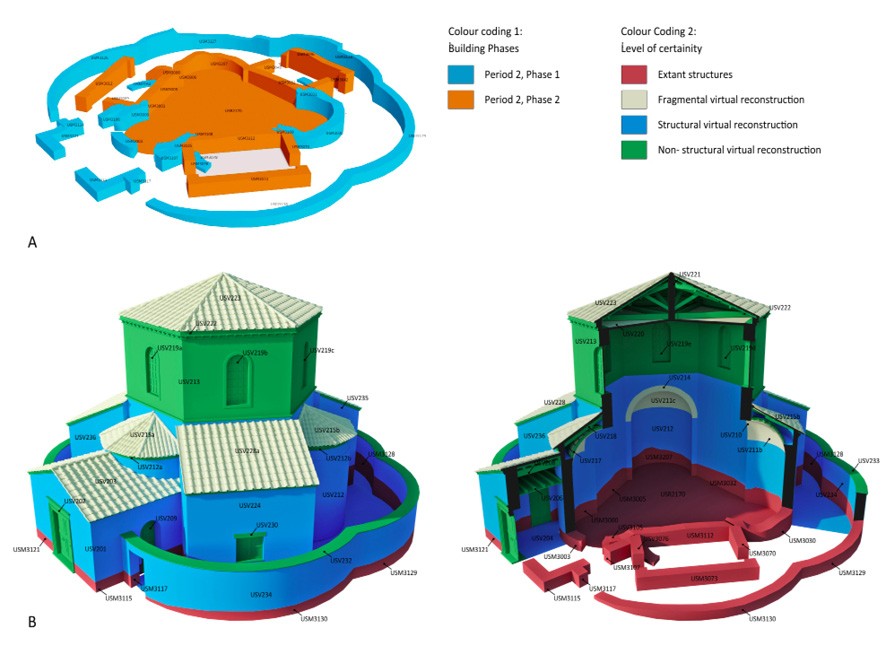 Furthermore, the Proxy model allows a conceptual visualization using different colour coding. In our case two colour codification was created. The former highlights, in the digital replica, the different building phases (Fig. 10, A). The latter shows, in the reconstructive model, the different level of certainty basing on archaeological evidences. The colours distinguish extant structures (red) and repositioned fragments (yellow) from their completion and hypothetical reconstruction (blue). The green colour finally paints all those parts for which we have no structural or archaeological evidences, but their reconstruction is entrusted to comparisons or interpreted sources (Fig. 10, B).