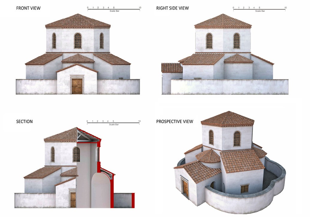Given that it seemed that the plan of the building was based on a module (a part providing the reference unit for the whole architecture) [34]: the diameter of an apsis (external 20 feet; internal 16 feet). We adopted this module to estimate walls elevation (Fig. 8 B). Obviously other proportional solutions were possible but this one was chosen for two reasons. The first is the symmetry. The building has a width-to-height ratio of 1:1 - 1,6:1 considering the ambulatio - and the ratio between the height of the central room and the apses of 1:2. The ratio between the diameter of the apses and the diameter of the lobes of the ambulatio is also 1:2. Similar ratios and symmetric proportions can also be observed in other late antique buildings (although belonging to other contexts and with different functions). The second is that higher walls could have overloaded the structure considering their thickness. However, this interpretation might be updated with new hypotheses following future discoveries.