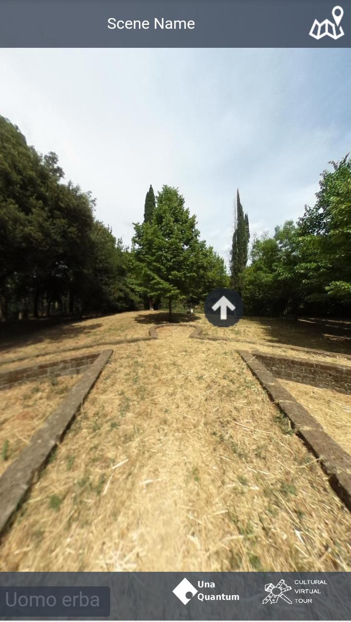 Il virtual tour realizzato si presenta con una schermata occupata quasi esclusivamente dalla foto sferica, alla cui apertura, essendo attiva la modalità ”autorotazione”, inizia appunto un movimento automatico che deve invitare il fruitore ad assumere il controllo della visita.