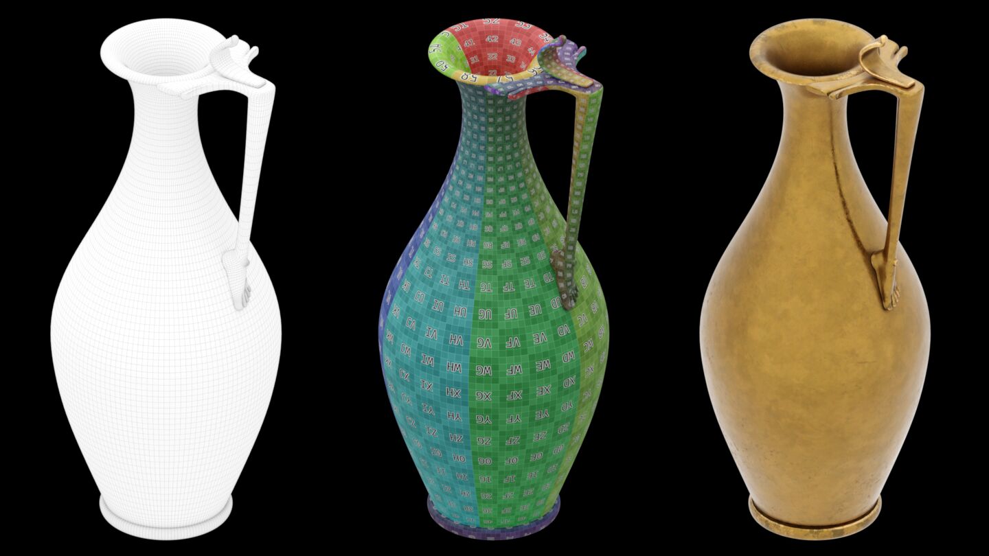 Other types of assets, such as sumptuary objects and jewellery, were also created with a similar approach, in this case using archaeological drawings as references. But because of its higher complexity, the modelling process was in some cases slightly different and required the use of other modelling tools and techniques, such as bèzier curves and digital sculpting. In order to optimise the process —keeping the number of polygons in the scenes as low as possible while showing a high level of detail—, two copies of the same object were created: the first one, more detailed, with a higher number of polygons and a second, lighter copy.