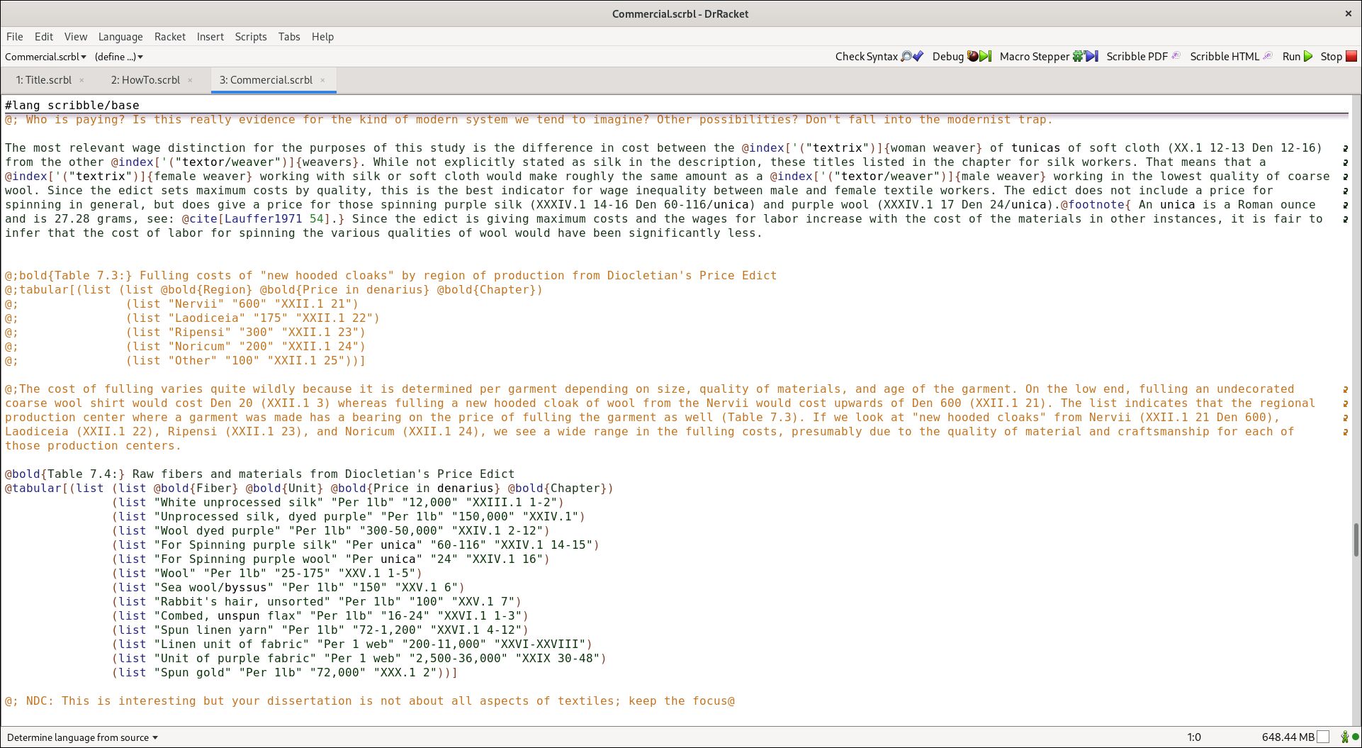 Figure 2. Screenshot of the commercial chapter of my dissertation showing Scribble formatting including commented out notes, and tags for the index, citations, and tables. -