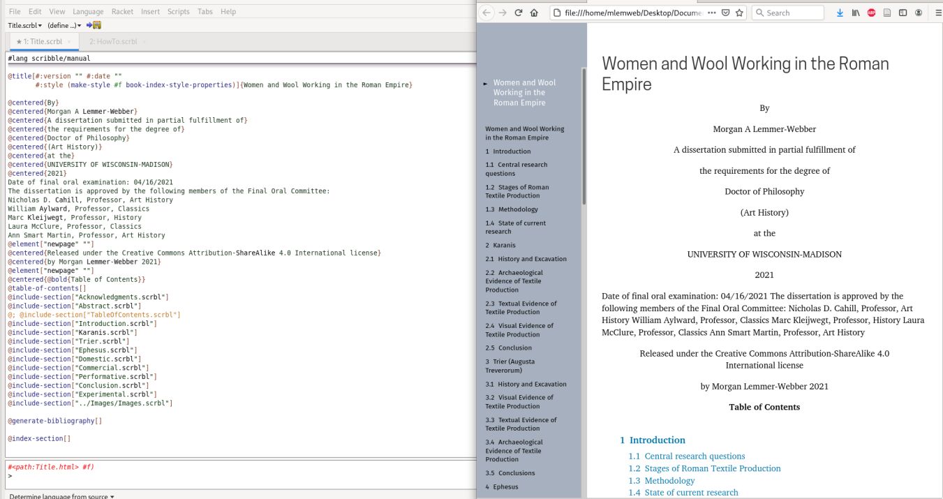 While writing my dissertation in Scribble had many benefits, it also added layers of stress to an already difficult situation. Like most people within academia, I had years of experience writing papers using a word processor. While a lot of the tasks in that workflow are tedious, they are at least familiar. Using a markup language introduced unexpected issues that I wasn’t always able to fix in a timely manner. It is difficult explaining to your committee members that while italicizing words in foreign languages is a trivial task in a word processor, it was an export error for my dissertation. Even though none of the text in the exported draft that I submitted had italics, behind the scenes the correct words were still marked as italic in the source document but a solution we applied to fix one formatting error somehow corrupted other areas of formatting. This issue arose because debugging LaTeX output is difficult at the best of times but debugging auto-generated Latex as an intermediate step between the markup language (Scribble) and the final document format (PDF) is even more difficult. The level of complexity here can be inferred by the fact that it was easier, in the end, to write an entirely new export method to ODF than debug the existing Scribble to LaTeX to PDF exporter. With a lot of work, we were able to find workarounds for all of these issues by the time I needed to submit my dissertation but troubleshooting these issues averted my attention away from writing the content of my dissertation. That being said, this article is an overview of my own personal experience using these technologies and therefore has a sample set of one. I have only written one dissertation, and without a control sample, it is hard to say whether I spent more time trying to debug my encoded dissertation than I would have individually formatting every image, manually compiling an index and all of the other minutiae that were successfully automated in my workflow.